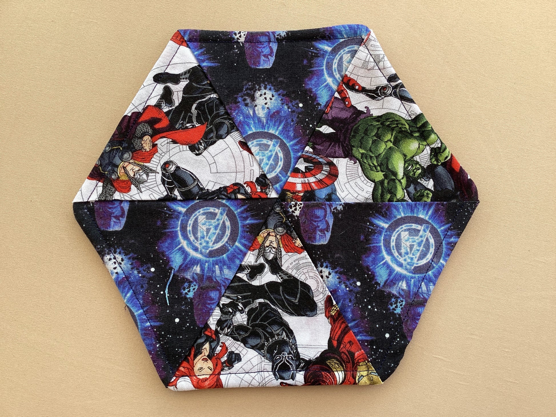 The Marvel Avengers Hexagon Trivet can be used as a pot holder or for electronic device charging cable management. Made of 100% Cotton